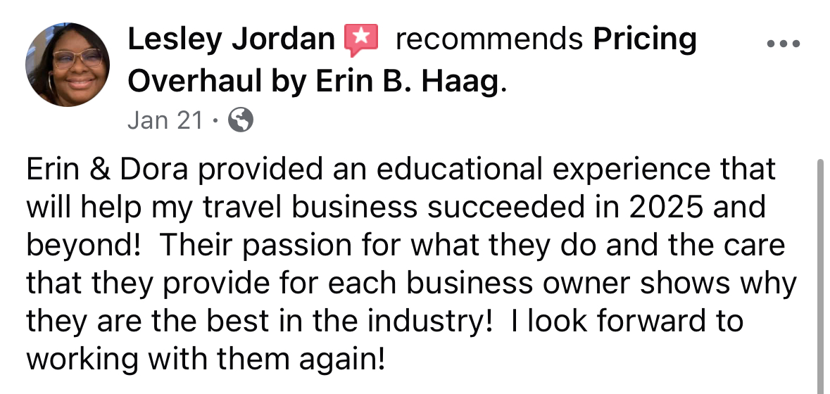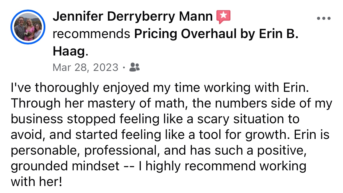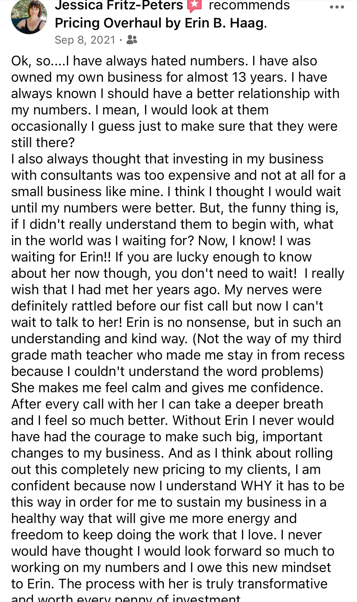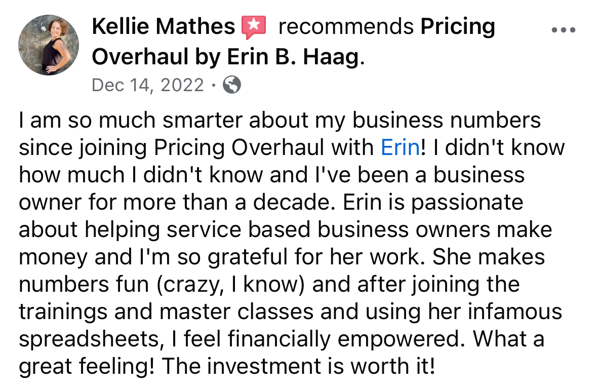 “The numbers talk, and they tell stories. What we extract from these stories and how we apply this information, matters. Erin’s step-by-step Pricing Overhaul® teaches you to critically think about where you are and where you truly want to be. Often, that gap is in the pricing! This formula allows you to plug and play, observe and tweak, and respond intentionally rather than to simply react. Erin’s confident coaching has made a lasting impact, and I hope women entrepreneurs step into their own power by learning her processes and executing fearlessly!”