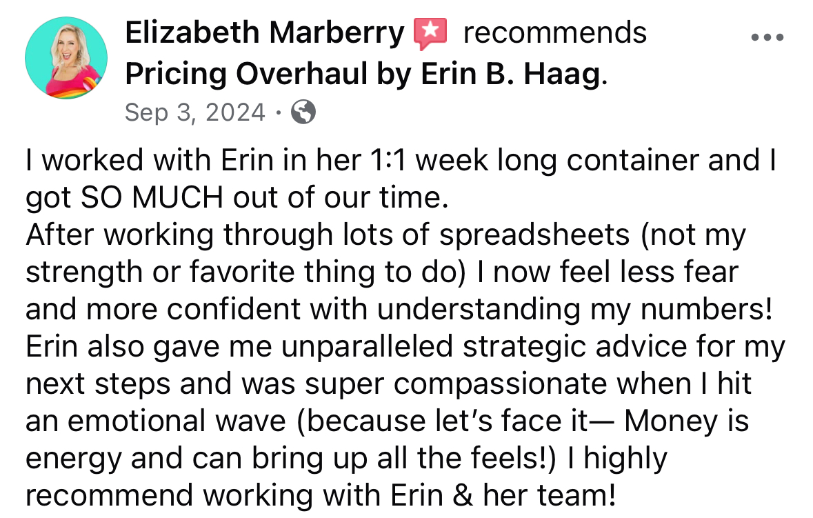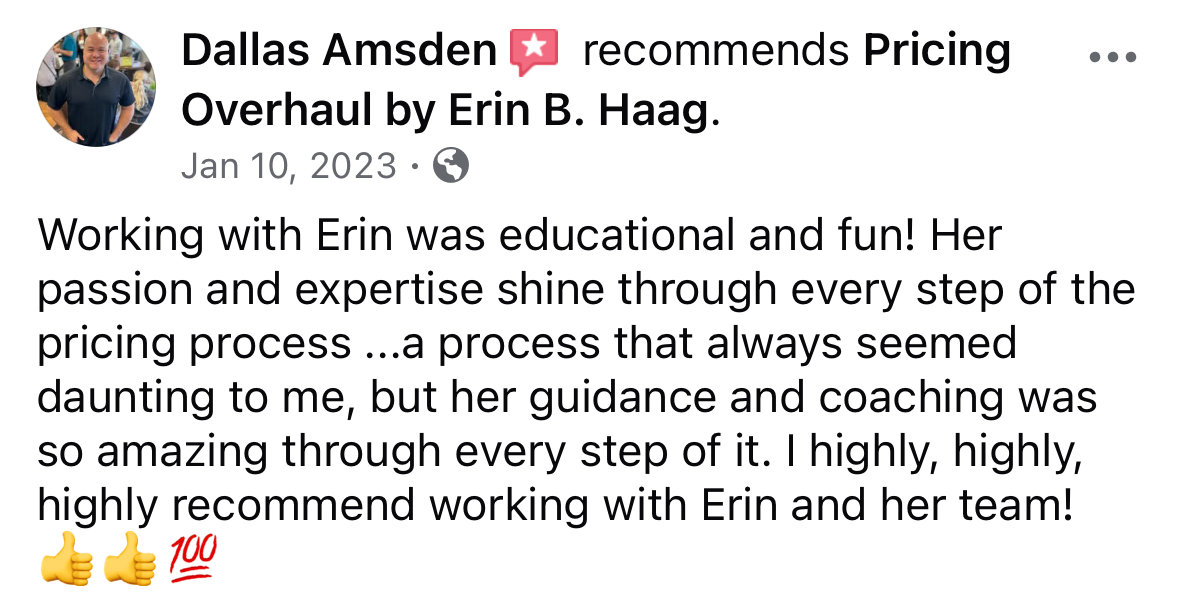 “Erin did more for me in one hour than I was able to do on my own in a year. I can figure out profitable pricing, but connecting all the different options (1:1 vs group and clear offers with upgrades and downgrades) in a clear and logical way was frustrating me – and Erin’s Pricing Overhaul® fixed it like magic. Don’t get stuck when this awesome resource is available!”